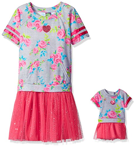 Floral jersey to sparkle mesh drop waist fashion dress. Comes with matching doll garment.