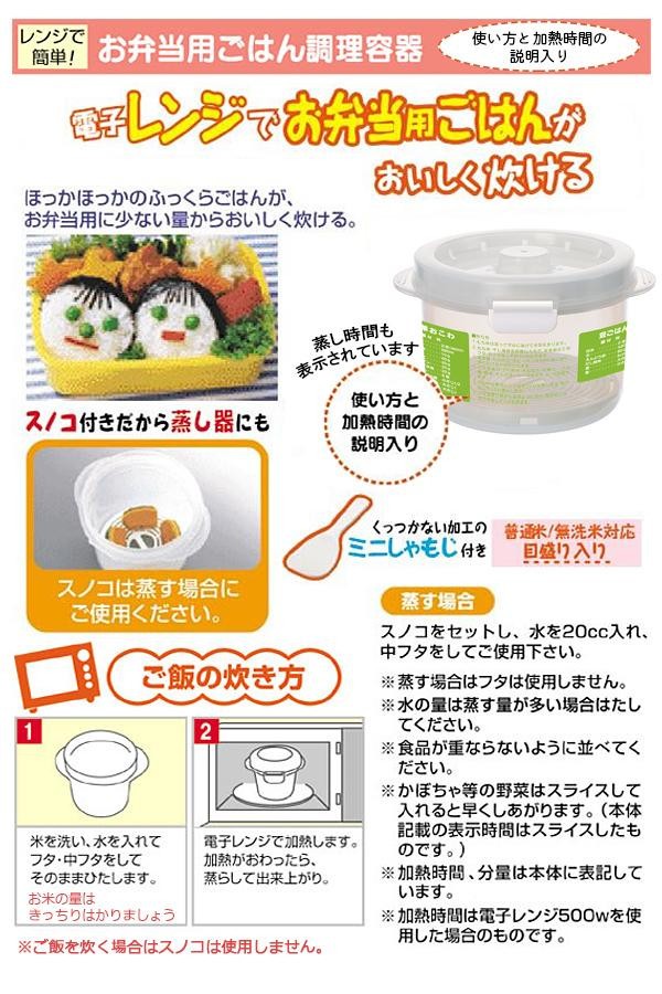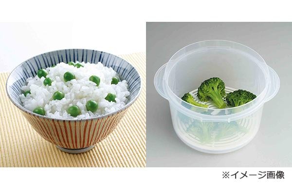 電子レンジでふっくらご飯が炊ける調理容器です。スノコが付いているので蒸し料理にも使えます。1合・2合の水量目盛り入りで、無洗米・普通米用の計量カップ付き。忙しいお母さんや、炊飯器を持っていない一人暮らしの方にオススメです♪ |