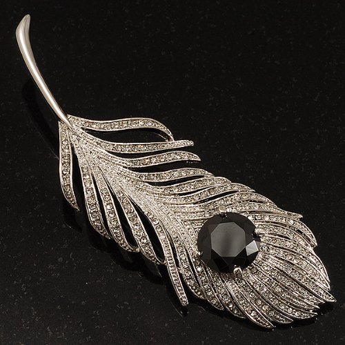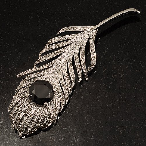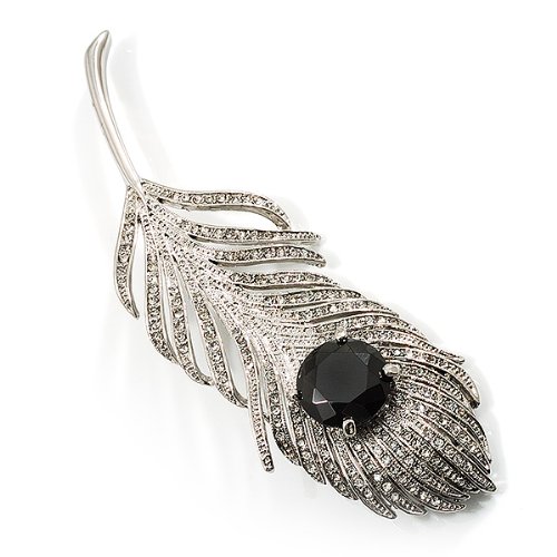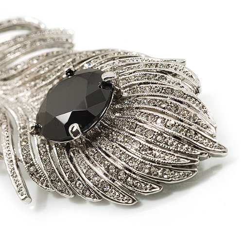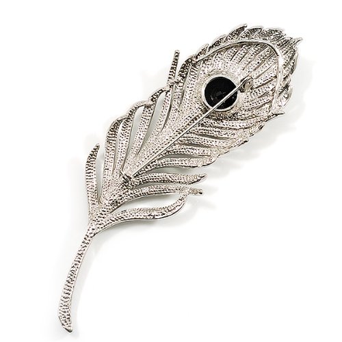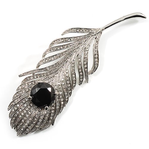 -. Title : Large Swarovski Crystal Peacock Feather Silver Tone Brooch (Clear & Black) - 11.5cm Length