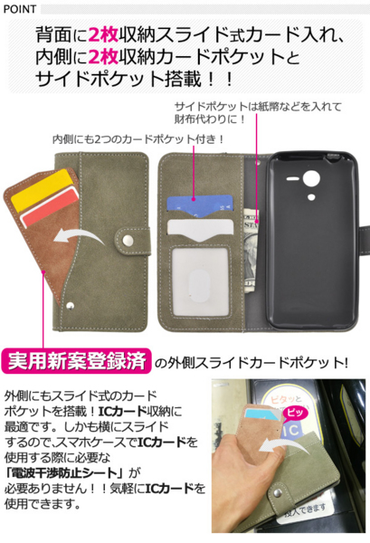 背面に2枚収納スライド式カード入れ、内側に2枚収納カードポケットとサイドポケット搭載した、