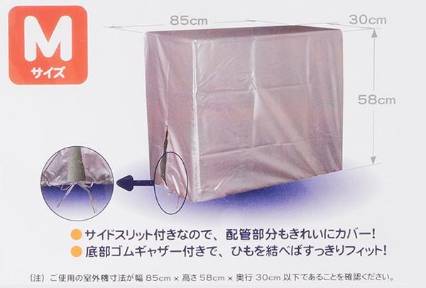 | 幅85×高さ58×奥行30cmのMサイズ(100Vタイプ用)室外機カバーです。サイドスリット付きなので、配管部分もきれいにカバーします。底部ゴムギャザー付きで、ひもを結べばすっきりフィットします。 |