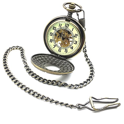 -. Title : Bronze Tone Roman Number Hollow Case Classic Half Hunter Arabic Dial Mechanical Hand Wind Pocket Watch W/Chain Relogio De Bolso