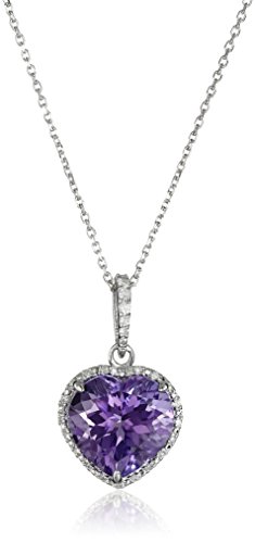 Sterling silver necklace featuring heart-shape gemstone with halo of small diamonds