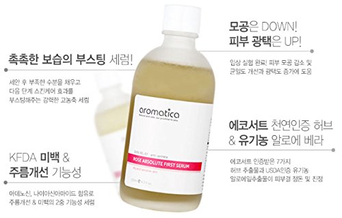 aromatica’s Rose Absolute First Serum is a highly enriched essence containing bulgarian damask rose oil and organic herb extracts, providing vitality to the skin.