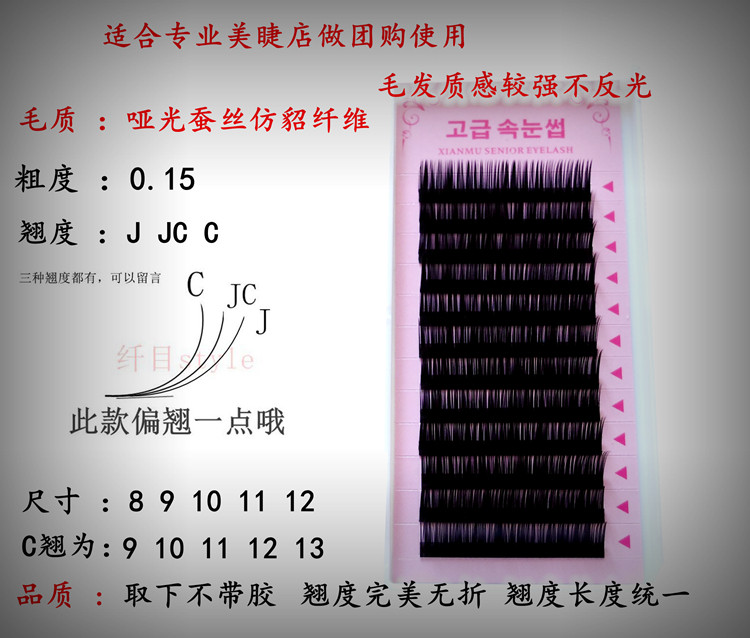 请注意这款材料是蚕丝纤维,也可以叫貂毛纤维,总之不是容易变形的动物毛发注意!此款翘度偏翘,一般推荐J翘或者JC翘,C的翘度已经特殊加强相当于D的翘度了,请根据需要选择