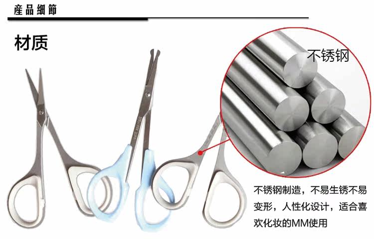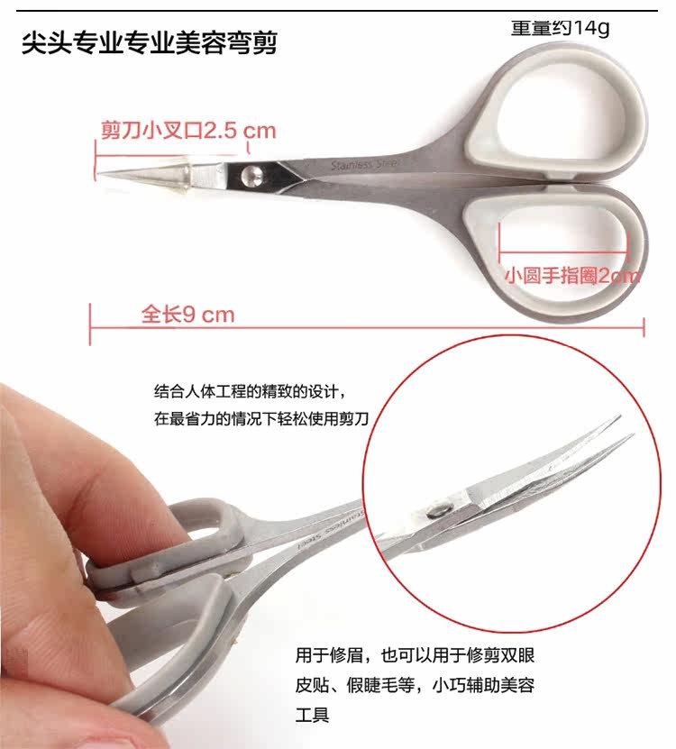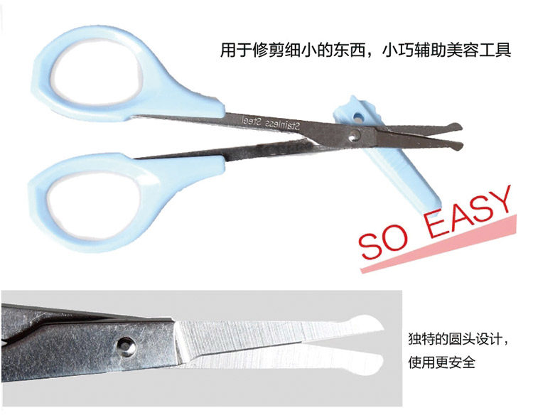 主要功效:可用于修剪眉毛、睫毛、鼻毛、小线头等。眉剪头部有点点弧度更方便操作。