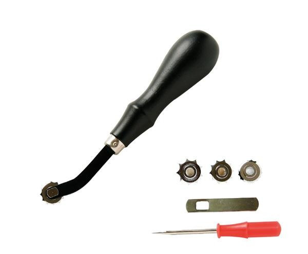 | 径の小さなコマとシャフトのアール形状により、力を加えても無駄に転がる事なく確実に作業が可能です。またコマ取付け部はコンパクトで縫い線の確認を行いやすく、ヒシ目打のピッチに合わせた4サイズのコマも付属し手縫い作業を確実にフォローします。 |