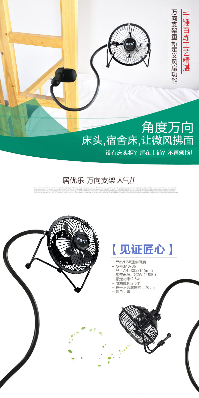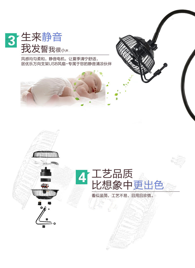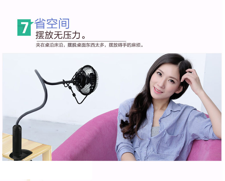 This stent fan is specially designed for fixed space in the narrow space of the desk, bookshelf, bed and so on. The main advantage is that it is fixed and can be fixed in a variety of small spaces. The long arm can adjust the wind direction freely. Because of this use, the need for light, so the fan head is 4-inch USB interface fan