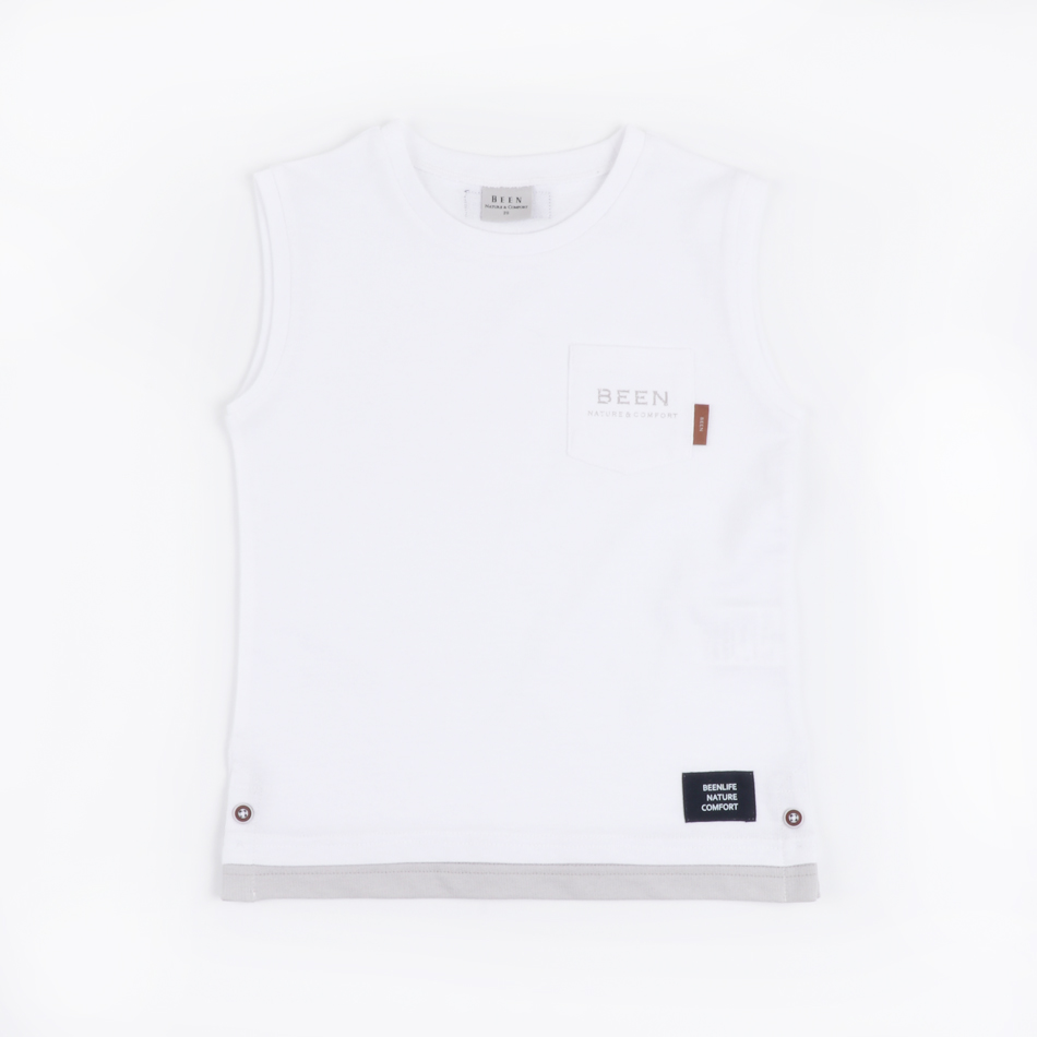 시원한 화이트컬러의 슬리브리스 티셔츠 입니다.슬리브리스 아이템이지만 소매를 살짝 덮는 실루엣이 특징인 아이템입니다.밝은 그레이컬러의 배색처리하여 시원한 타운 스타일링이 가능하고 네이비숏팬츠와 함께 코디하여리조트한 타운 스타일링을 제안합니다.