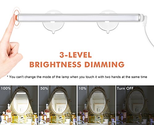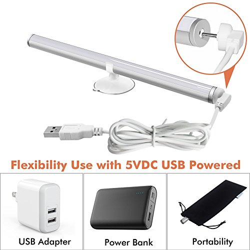 - 【USB Power,Easy to Use】-Universal 5VDC USB powered vanity light make you could use it anywhere plug into a usb port on an electrical usb power supply unit and also with power adapter.Touch sensitive Aluminum light body with fashion and noble silver color,enhance the look of your home, offer rthe extra light when you making up.