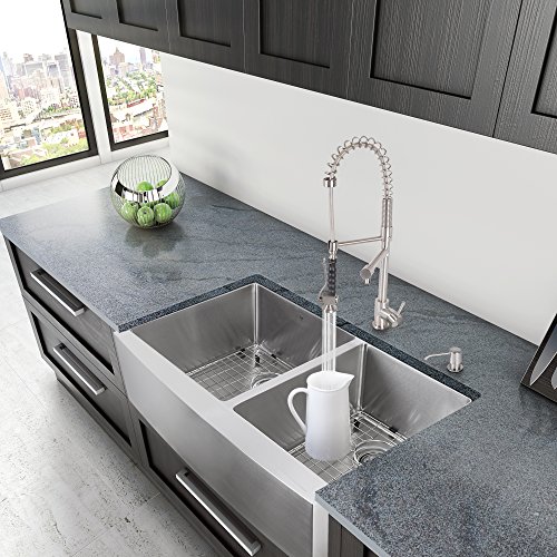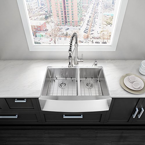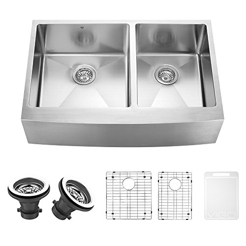 VIGO 33-inch Farmhouse Stainless Steel Kitchen Sink with Rounded Edge, Two Grids and Two Strainers