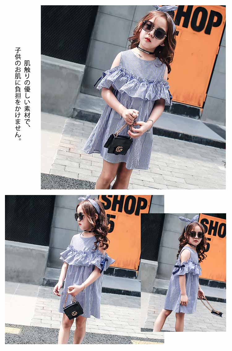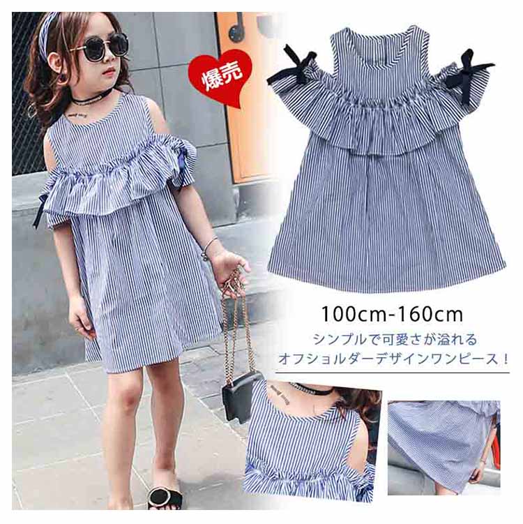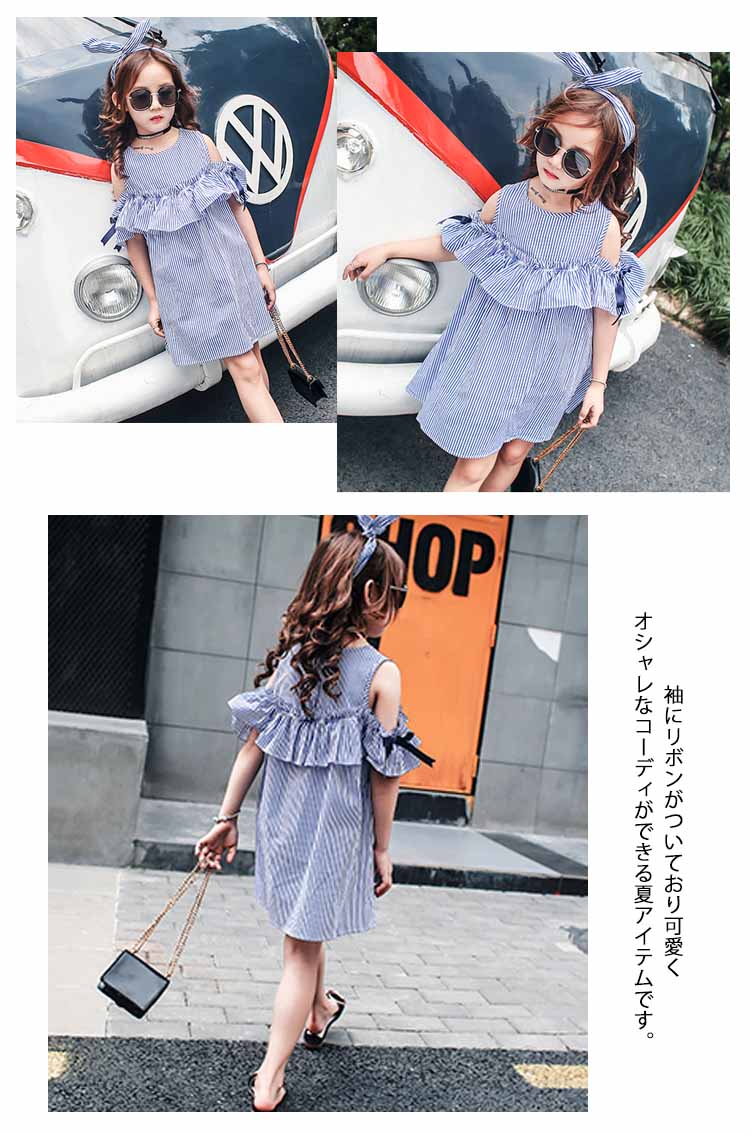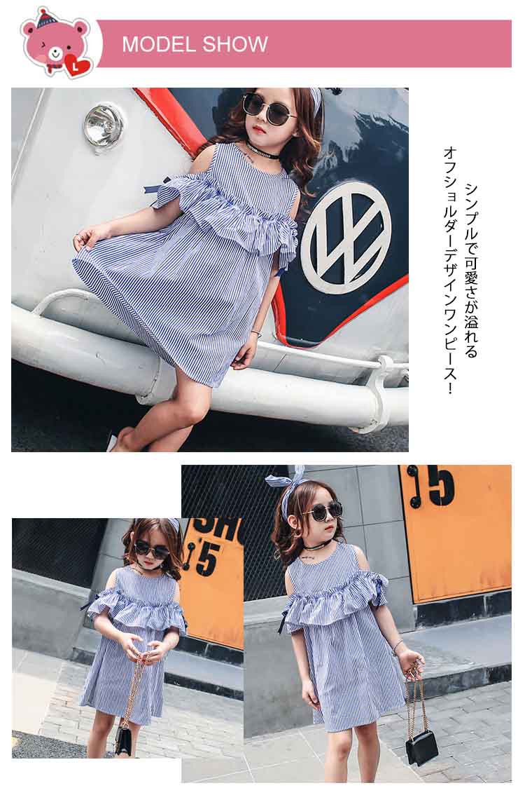 | シンプルで可愛さが溢れるオフショルダーデザインワンピース!肌触りの優しい素材で、子供のお肌に負担をかけません。袖にリボンがついており可愛くオシャレなコーディができる夏アイテムです。入学式や卒業式、発表会などにどうぞ! | |