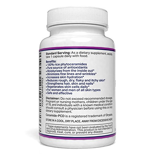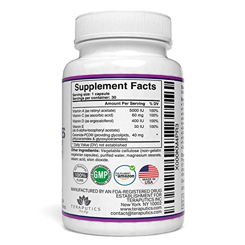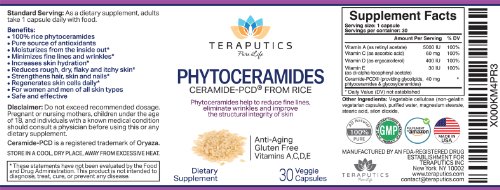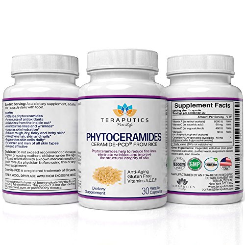 - Feature : The leading brand of Phytoceramides. Our adherance to integrity, quality and potency has made Teraputics Phytoceramides a best seller in skincare supplements / Contains Ceramide-PCD® and Vitamins A, C, D & E, all perfectly formulated together in our state of the art lab right here in the United States. Our Phytoceramides are 100% pure making them a preferred alternative to other skincare products that carry undesired side effects / Third party tested for purity and potency. 40mg per capsule, 30 vegetarian capsules per bottle. Our rice phytoceramides are Non-GMO, vegan, and gluten-free / 60 day money back guarantee. Made in the USA. Our Phytoceramide supplements are made adhering to the highest GMP standards of product integrity. Personalized customer support. With every Teraputics purchase our customers gain access to our team of highly trained service professionals, available to help with questions about any of our health products / Getting started guide emailed to you after purchase. This is the most comprehensive guide to using Phytoceramides correctly that you have ever seen!
