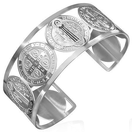 -. Title : Stainless Steel Cross St. Benedict Religious Christian Open End Cuff Bangle
