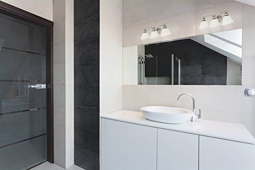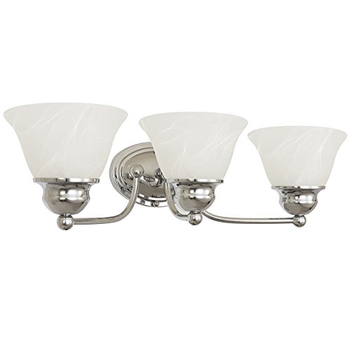 This traditional bathroom lighting fixture features a polish chrome finish and alabaster glass. It can be mounted indoors and be used for up or down lighting. The fixture accommodates (3) LED, CFL, or 60W incandescent bulbs (not included), and would look great in any bathroom.