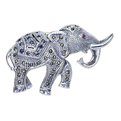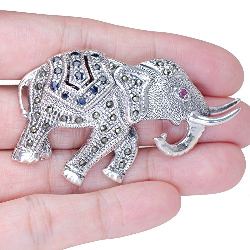 -. Title : Natural Sapphire Marcasite Gems Elephant Thai Style 925 Sterling Silver Brooch