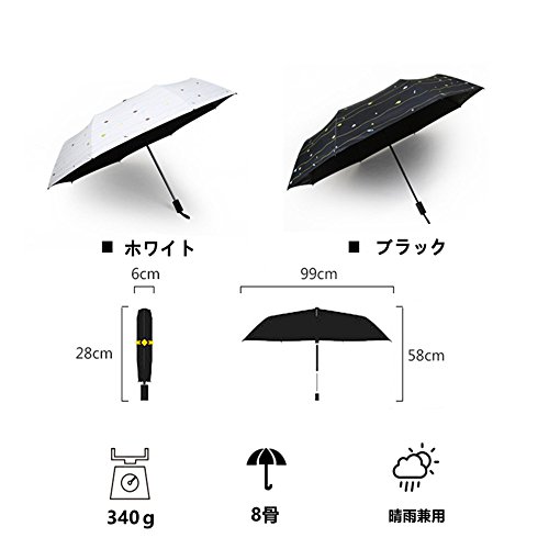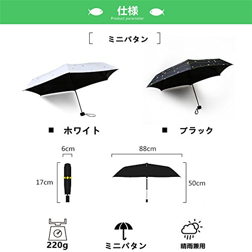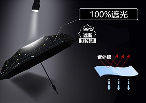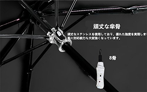 -. Feature : 【軽量で便利】弾力のグラスファバー製とアルミニウム合金軽量骨を使用、重さは同じ商品より小さく、小型ペットボトルとほぼ同じ、持ち歩きにも苦になりません。コンパクトなので、バッグに入れたり、車に予備として入れるのは便利です。 / 【遮光】遮光率99.99%かつ完全遮光のため、光を通さず人の影が浮かびません。熱線となる紫外線や可視光線をカットすることで、「眩しくない」日傘を実現しました。有害な紫外線からお肌を守り、日焼けを防ぎます。炎天下でも涼しく快適に過ごすことができます。 / 【超撥水性】超高密度のテフロンポリエステル材料で作られ、防水試験レベル5(最高レベル)に合格しました。豪雨の中に傘の下に入れば、体のどこも濡れません。雨が落ちたときに滴を撥水します。傘を閉じた後軽く振ると、全ての水滴を振り払えます。 / 【耐風性が強い】 グラスファイバー製の傘骨で、アルミニウム合金製の傘より優れた耐風性を持ってます。強い風が吹いても骨が曲がることも裏返ることも絶対ありません。