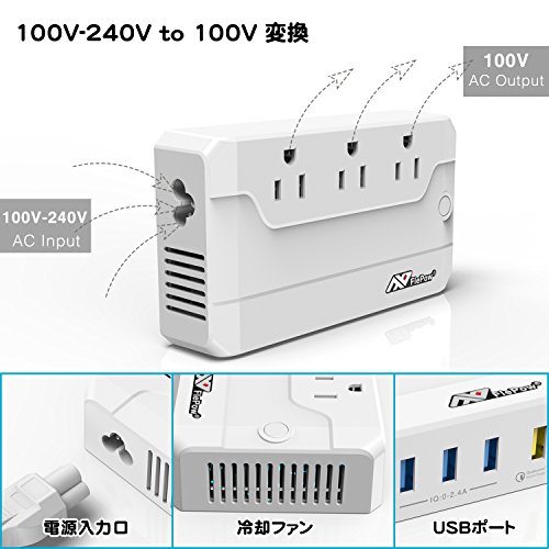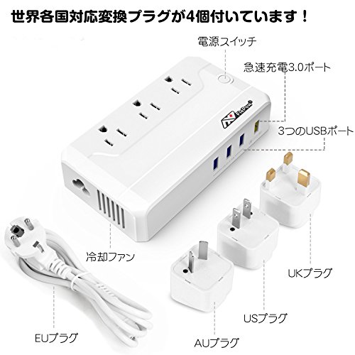 ② [rapid charging is possible (Quick Charge3.0)] AC outlet 3-neck, USB4 port (one Quick Charge3.0 + 3 one is USB port) with a, so can charge multiple devices at the same time, the outlet at the accommodation you can eliminate the shortage. Also, when you want to charge in a hurry, Quick Charge3.0 port can be charged at four times the speed than the normal port. ③ [Safety and Security] can be used to control the surface temperature of the body (55-60 ℃). To prevent the fire from overheating. Thermal protector (automatic return) built-in safety design of the addition, over-current, it will be available with confidence because you have a device to prevent over-voltage and short-circuit. ④ [ultra-quiet] is equipped with a cooling fan, but accustomed to comfortably use for ultra-quiet. It does not get in the way even during sleep. ⑤ [conversion one year warranty with plug & peace of mind] conversion plug four (EU plug, UK plug, US plug, AU plug), so is attached, you do not need a plus buy new! Of one year from the date of purchase of this product warranty will apply. Sorry to trouble If you have caused a problem with the quality, but please give me connection from the order number of the Amazon. ① [at the time of long-term stay / travel in foreign countries] can not be used because the voltage even if I try to use the electrical products in Japan is different overseas. This product converts the 90V ~ 240V to 100V, to be able to use the consumer electronics products of Japan even in foreign countries (digital cameras and mobile phones, the following electrical products 200W, such as digital music players). And because it is more compact than anything, you can carry on without bulky. So also with storage case, it will be combined into one.