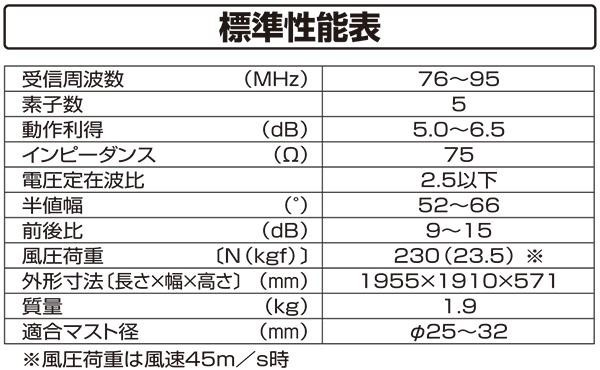 | FM補完放送対応の5素子FMアンテナ。 |