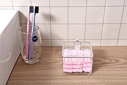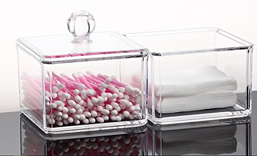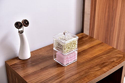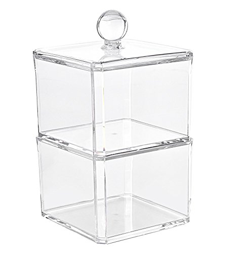 Approximately measures 3.7''LX3.7''WX6.5''H Multi Uses Can be put in any possible place: dresser, office desk, bathroom countertop, washroom, kitchen etc. A Sweet Home For Your Vanity This clear plastic swab storage box has 2 stackable boxes.Declutter your life and fill this clear organizer box with whatever you need to store.It's the perfect size container to fit your cotton balls in one box and my cotton swabs plus cotton pads ,qtibs,accessories,dental floss swords etc.in the other. Worry-free Warranty: At Yongs, we believe in our products and As a factory we have a big team backside to support you. That's why we back them all with an 18-month warranty and provide friendly, easy-to-reach support. If for any reason you're not completely happy with your purchase- if it breaks, if it's damaged in shipping, or even if you change your mind - simply let us know and we will either replace it or refund your money. Just mail us! Warm Reminder: This product comes from an injection molding which causes something like scratches similar as hair with different shapes and different length. This is because of the process. It exists generally and it is not artificial damage, It will be covered once it is full of vanity. But if you are really mind of it, Please leave it. Accessories are not included! Product Maintenance: Please don't slam on the ground. Please don't put in the microwave. Put it in a cool and dry place to protect from the sun. This product is non-compressive; please don't put heavy things on top of it. Keep away from sharp things or coarse items to protect from scratches. Keep away from fire! This display storage boxes can bear a 70 degree temperature maximum Please use cloth with toothpaste to wipe gently or rinse thoroughly with water if there are stains