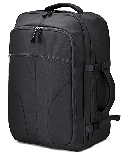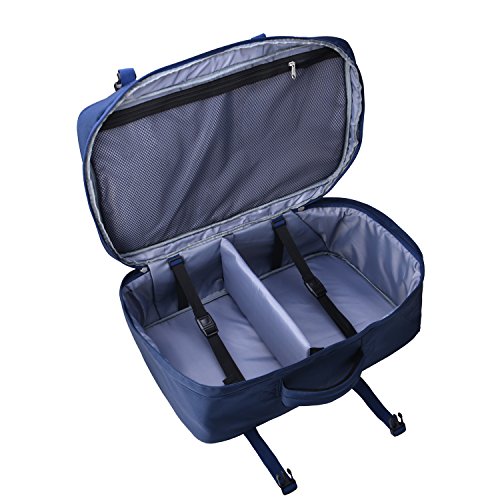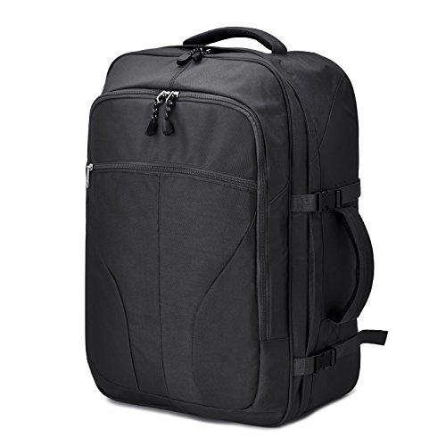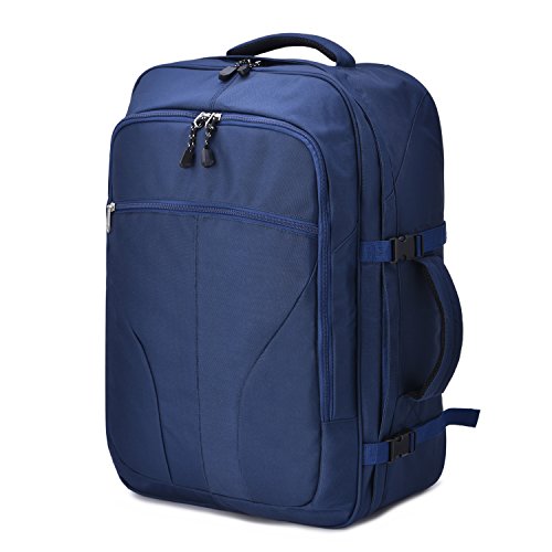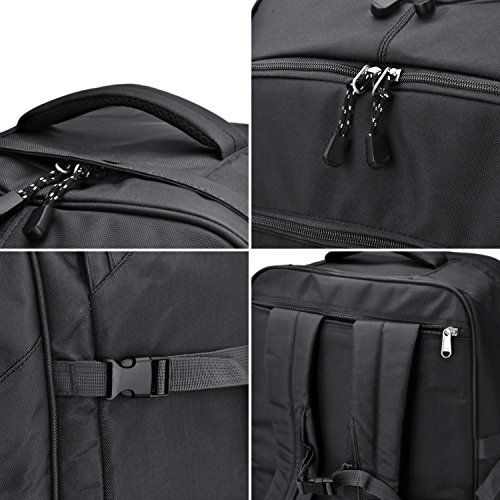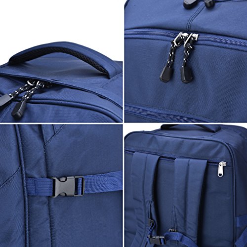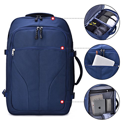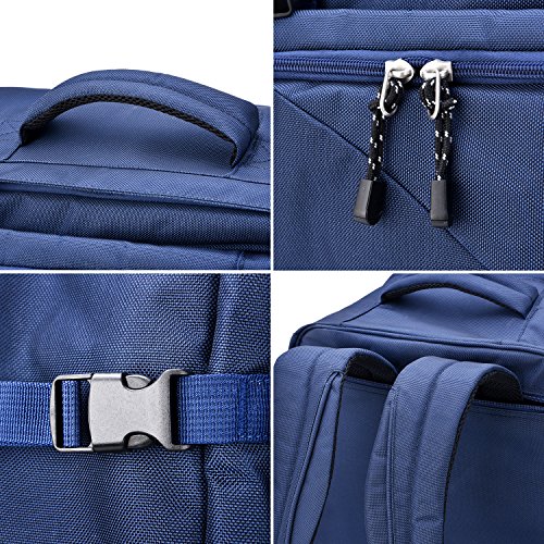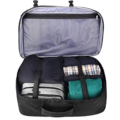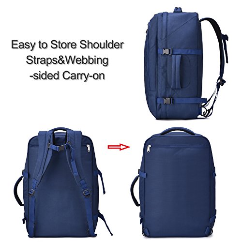 Product Description Basic information: Material: 1680D Nylon Polyester Lining Dimension: 15'L x 10'W x 22'H Capacity: 54 L Color: Black / Blue Type: Weekender Backpack/ Duffle Bag Style: Casual Occasions: Short trips, weekend travel, camping, hiking, etc. - Carry-on size for your trip. Measuring 15'L x 10'W x 22'H, this backpack is big enough to store travel essentials for a week trip. And the decent size makes it perfect to bring as a carry-on luggage on the airplane. - Hideaway padded shoulder straps for added comfort. - Orange lining helps you identify and find your items more easily. - Waterproof nylon fabric to protect your items from extreme conditions in the outdoors. - Exterior Structure: 1 zipper front pocket 1 flap pocket with pen holder, phone pouch, key chain and mesh pockets to keep items breathable; 4 side straps with buckle closure, perfect for carrying items like picnic blanket. - Interior Structure: 1 mesh compartment for shoes, toiletries or dirty clothing; 1 large compartment with a removable Velcro divider for easy organization; 2 straps with buckle closure to further secure your items. Care Instructions: - Hand wash the product with mild soap. - DO NOT wash it with hot water and alkaline detergent. - Hang dry and store in ventilated place instead of exposing it to the sun. - Wash Separately to avoid staining. - DO NOT soak in water for too long. Notes: 1. Please allow 0.3"-0.9" in size error due to manual measurement. And please confirm the size info according to our description instead of the photos. 2. Please allow the smell in the course of packing and shipping, but it will be disappeared in a few days of airing out. 0