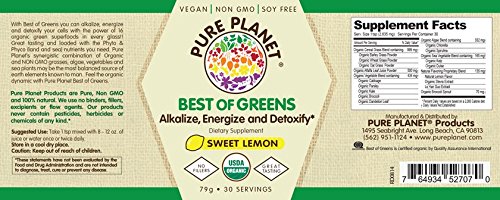 Best Of Greens Organic Lemon by Pure Planet Products 79 gm Powder Best Of Greens Organic Lemon 79 gm Powder Pure Planet Best of Greens Organic Lemon is a great tasting USDA Certified Organic dietary supplement that will help you alkalize energize and detoxify. It is vegan non-GMO soy free and does not contain fillers. With Best of Greens you can alkalize energize and detoxify your cells with the power of 16 Organic green superfoods in every glass Pure Planet Best of Greens is loaded with the Phyto and Phyco (land and sea) nutrients you need. Pure Planet's synergistic combination of Organic and non-GMO grasses algae vegetables and sea plants may be the most balanced source of earth elements known to man. Suggested Use As a dietary supplement Simply mix 1 1 2 teaspoon with 8-12 oz. of juice or water once or twice daily. Feel the Organic dynamic with Pure Planet Best of Greens in delicious Organic Lemon flavor. - Or as directed by your healthcare professional. Supplement Facts Serving Si