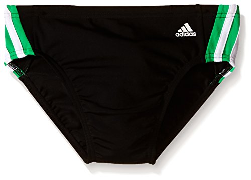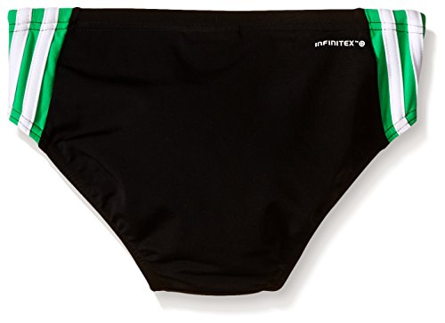 Product DescriptionSolid splice brief, infinitex fabric 100 percent polyester, keeps the suit fitting like new for longer, 4-way stretch provides compression color inset with iconic 3 stripes, interior draw cord0