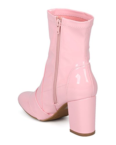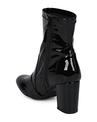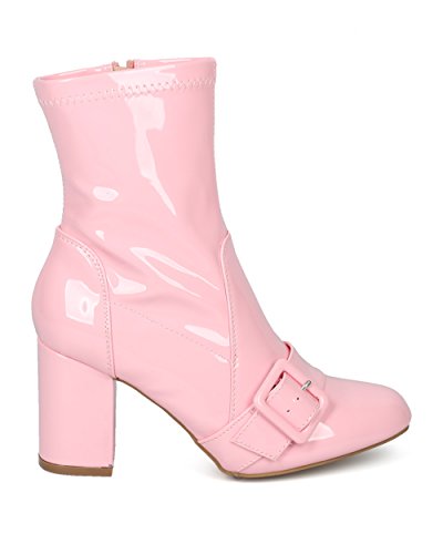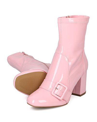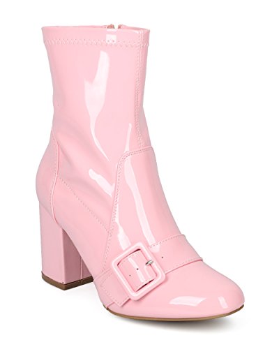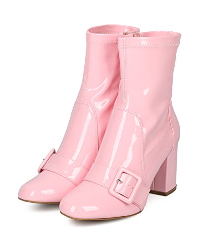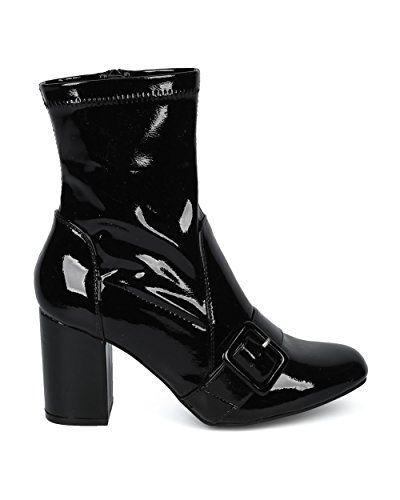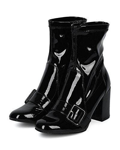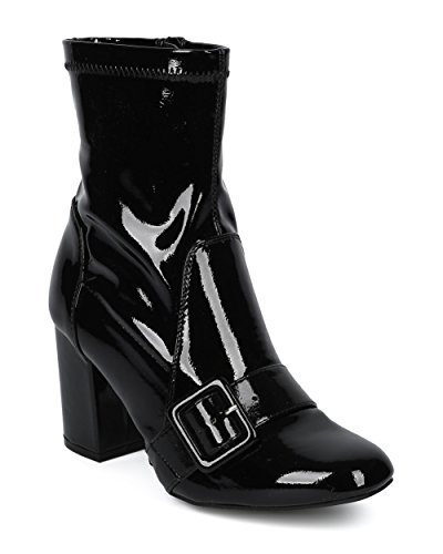 Product Description These patent ankle boots are made with a patent upper, round toe and belted faux buckle detail. Also made with a single sole, block heel and side zip for easy slip on and off. 0