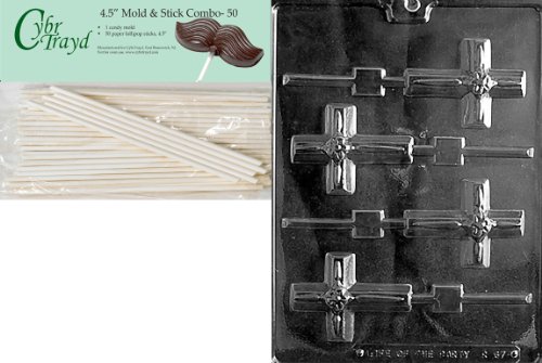 Cybrtrayd 45St50-R067 Small Cross with Flower Lolly Religion Chocolate Candy Mold with 50 Cybrtrayd 4.5-Inch Lollipop Sticks