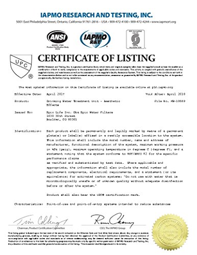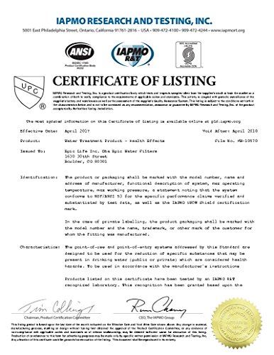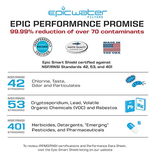 ★ TRIPLE CROWN WINNER The Epic Smart Shield was tested and certified out to 651 gallons by IAPMO to 3 different NSF/ANSI residential drinking water treatment standards. That means at Gallon 651, the Epic Smart Shield is still removing over 70 contaminants at the 99% level with no drop off. Many under-the-sink water filter impostors on Amazon make ridiculous claims without backing them up with certified third party testing by accredited agencies.