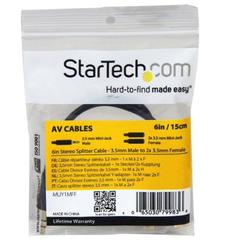 This 3.5mm Stereo Splitter Cable/Y-cable features one 3.5mm male and two 3.5mm Female audio connectors, splitting a single headphone jack into two. A practical, cost-effective audio solution, the 3.5mm stereo splitter cable features fully molded strain relief for long-lasting durability and high quality gold terminals to ensure corrosion-free connections. The 3.5mm audio splitter/Y-cable is backed by StarTech.com's Lifetime warranty.Feature