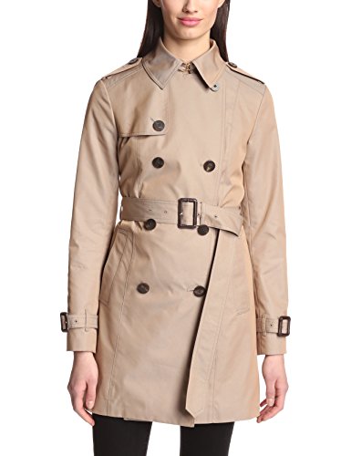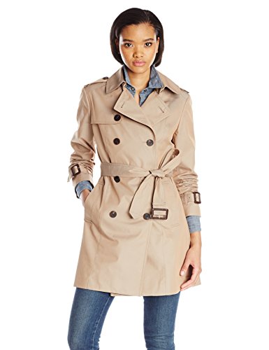 Double-breasted trench coat with faux gun flaps, self-belt, and accordion pleats at back skirt