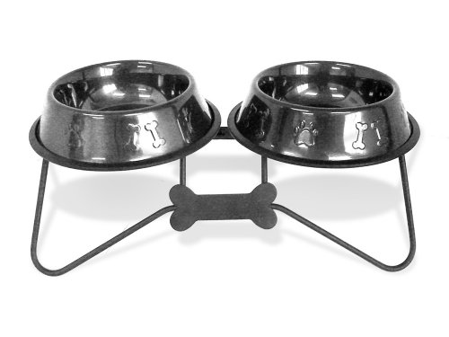 -. Title : Platinum Pets Double Bone Tie Diner Stand with Two 4-Cup Black Chrome No-Tip Embossed Bowls