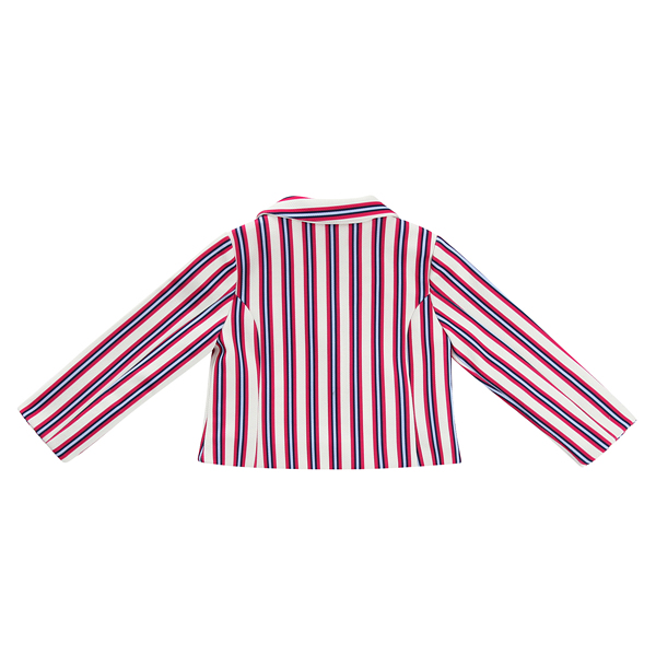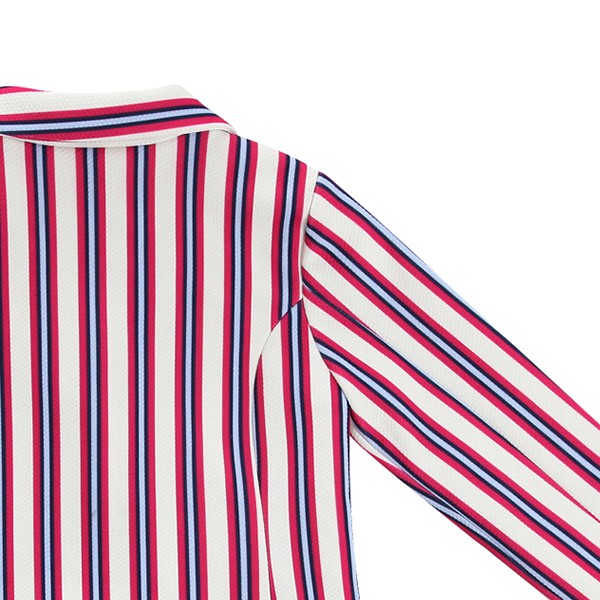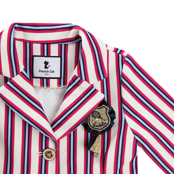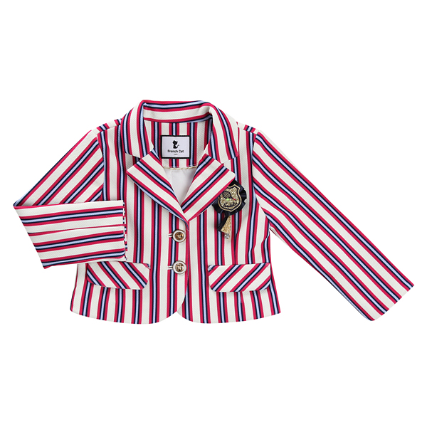 상품설명 트렌디한 느낌의 멀티 스트라이프가 세련된 느낌을 주는 포멀한 느낌의 카라 자켓입니다. 스트라이프 패턴이 타 브랜드와는 차별된 유니크한 코디감을 주는 제품입니다. 앞 가슴의 블링블링한 와펜 장식이 포인트가 되는 자켓입니다.