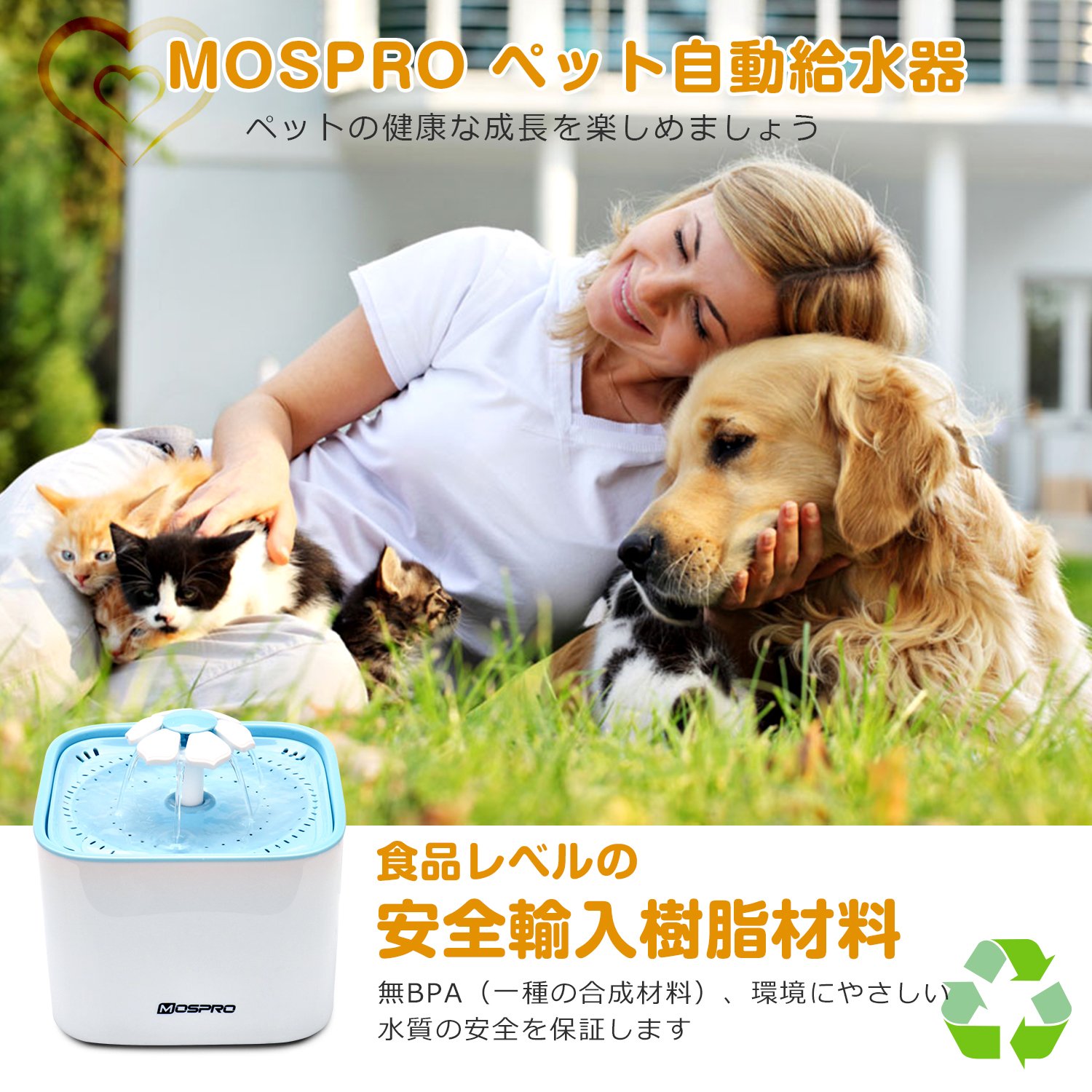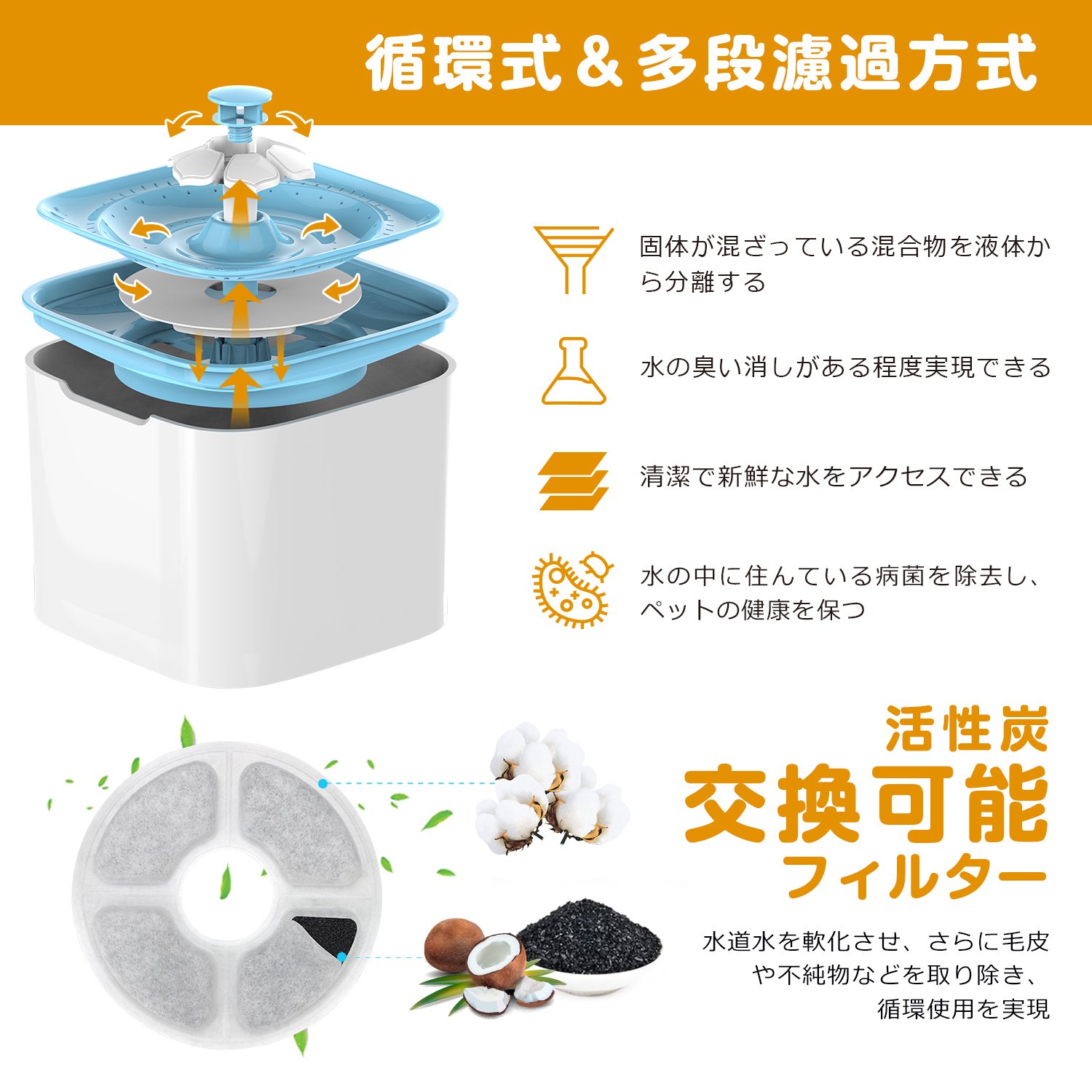 【人体工学設計】出水モード/三つ:滝モード、泡立ちモード、噴水モード。 「凹」字型水槽設計と水循環設計を採用し、空気との接触面積をさらに広くしたことで水に酸素を補充できます。表に猫や犬の好きな空色で塗装されており、人にはシックなイメージを与えます。