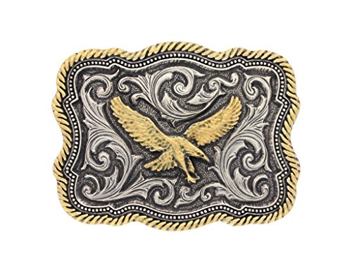 Studio : Montana Silversmiths Publisher : Montana Silversmiths Binding : Apparel Product Description Complete your outfit with an eye-catching belt buckle from Montana Silversmiths. This buckle has scalloped edges, a twisted rope trim, pinpoints, a leather carving design, western filigree, and has a gold soaring eagle in the center. This two-toned buckle is a standard 1. 5" and is the perfect buckle to go on your belts. Ensure you only have the best, starting with this buckle from Montana Silversmiths. 0