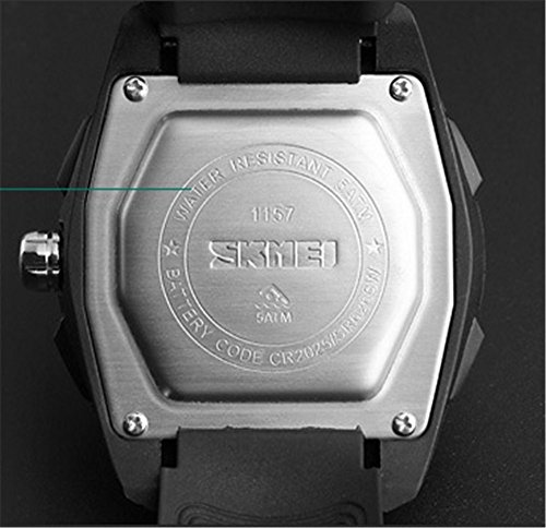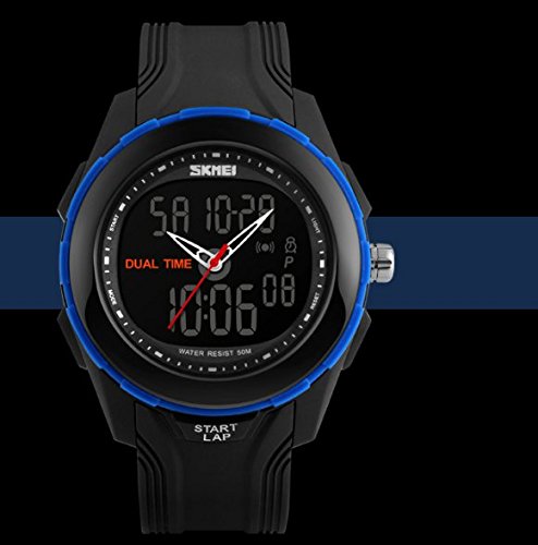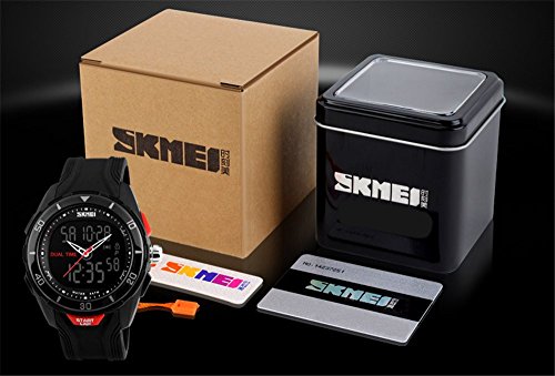 -. Feature : Special function alarm, calendar, chronograph, luminous / Selection of high quality EL light film, durable, double significant dual movement. / High-quality PU material strap, comfortable, soft, high-quality PC shell, earthquake, drop, anti-scratch, the effect is excellent. / 50 meters waterproof, outdoor sports more convenient, bathing, swimming can be worn. / Provide SKMEI original box, English manual, battery quality assurance 1 year.