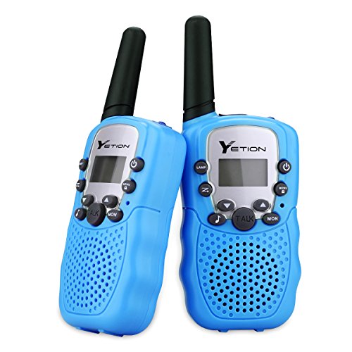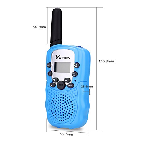 Description This YETION kids walkie talkies with a generous 3km range (MAX 5km open field) can help you to keep in touch with roaming children or a friend during an outdoor activity or expedition into the wilderness. This 2-way walkie talkies can connect each other in remote area or wild field where phone signal is poor and it has the perfect portable size for outdoor adventures. There's even a convenient belt clip to attach your 2-way radio walkie talkie when not in use and a cool LCD backlit display. Features: -22 channel PMR system auto scan function -Transmitting and receiving icons -Generous range up to 3km (MAX 5km open field) -Good sound quality, Adjustable volume level -Find an open channel fast with auto channel scan -LCD backlit display, battery status indicator -Stay connected to friends and family -Great for supermarkets, shopping centers, festivals and any outdoor activities Specification: Squelch: Auto squelch, CTCSS/DCS Scan: Auto scan 22 CH Alert: Call alert Lock: Channel lock Voice Transmit: PTT/ VOX function Radio Service: FRS/ GMRS Talk Range: 3 miles (MAX 5 miles in open field) Frequency Range: UHF 462-467 MHz Type: Handheld Battery: 3x AAA batteries for each Earphone Jack: 2.5mm/ 0.1inch Package Included: 4 x Walkie Talkies(12*AAA Batteries Not Included) 1 x User's ManualFeature