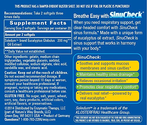 ReleaseDate : 2008-12-09 Studio : Enzymatic Therapy Publisher : Enzymatic Therapy Binding : Health and Beauty Product Description SinuCheck soothes mucous membranes and sinus cavities for clear-headed comfort fast. It is made with a unique, pure form of natural eucalyptus oil extract, to maintain healthy sinus drainage and relieve occasional irritation. 0