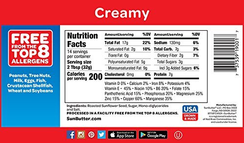 SunButter is made with US grown, roasted sunflower seeds. It has 7 grams of protein per serving and more vitamins and minerals than nut butter. SunButter provides 45% of the US recommended daily allowance for Vitamin E with no trans fat and less saturated fat than the leading brand of almond butter.