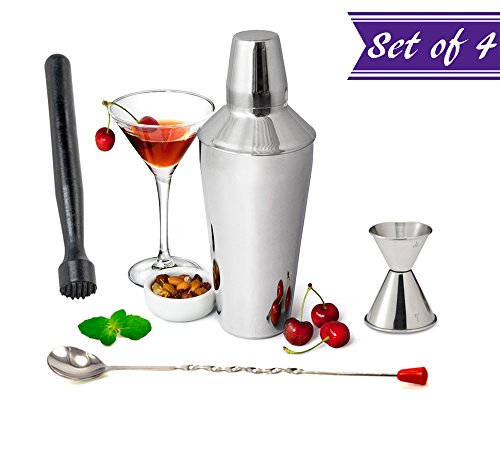 -. Title : 4-Piece Cocktail Bar Set by Tezzorio, 28-Ounce Cocktail Cobbler Shaker with Measuring Double 1 & 2 Oz Jigger and 11" Mixing Spoon plus 8" Netted Head Cocktail Muddler, Profesional Bar Supplies