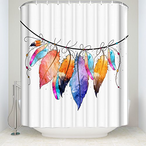 T&H Home Colorful Illustration Feathers, Shower Curtain Frabic Boho-Style-Abstract Polyester Set Hooks 72X80In