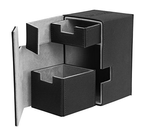 Super high quality XenoSkin card box with magnetic closure and card & dice trays for the protection and archival safe storage of up to 100 double-sleeved cards in standard size (e.g. Magic the Gathering, Pokemon and others ). - Holds up to 100 double-sleeved cards or 120+ single-sleeved cards - Innovative XenoSkin material with anti-slip texture - High-class microfiber inner material - Removable dice and accessories tray - Removable card tray - Independent access to cards or accessories - 4 magnets for very strong closure - Super rigid double-layer skin for maximum protection - Best for storing collectible cards in Ultimate Guard Sleeves - Dimensions approx. 142 x 88 x 91 mm.Feature