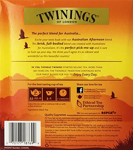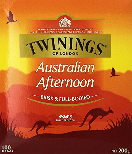 -. Binding : Misc. -. Brand : Twinings -. EAN : 0070177187699 -. Feature : Twinings of London / Australian Afternoon Tea / Full Bodied Black Tea Designed for Australia -. Label : Twinings of London -. Manufacturer : Twinings of London -. PackageQuantity : 1 -. ProductGroup : Grocery -. ProductTypeName : GROCERY -. Publisher : Twinings of London -. Studio : Twinings of London -. Title : Twinings of London Australian Afternoon Tea - 100 Tea Bags - Full Bodied Black Tea Designed for Australia -. UPC : 070177187699