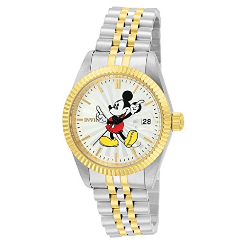 Invicta 22776 Disney Limited Edition women's watch features a 36mm wide and 13mm thick two tone yellow gold plated solid stainless steel case with a fixed bezel and textured push-pull crown. Invicta 22776 is powered by Japanese TMI PC32A quartz movement. This beautiful watch also features Mickey mouse printed sharp looking silver tone dial with white accents black luminous hands and index hour markers along with the date display function, scratch resistant mineral crystal and water resistant to 50 meters. Invicta 22776 is equipped with an 18mm wide two tone yellow gold plated solid stainless steel bracelet with a fold over clasp. Invicta 22776 women's Disney Edition silver dial two tone stainless steel watch is brand new and comes in an original Invicta gift box and is backed by a 5 year limited warranty.Feature