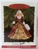 -. Feature : Hallmark Keepsake Ornament - Holiday Barbie - Fourth in the Holiday Barbie Collection 1996 (QXI5371) / Barbie stands approx. 3-1/2" in height. / Features Hallmark's 1996 addition to the annual Holiday Barbie Collection! / Barbie is stunning, as usual, in her festive burgundy and gold gown with white fur trim! / This Barbie ornament is the fourth in the Holiday Barbie Collection of ornaments.