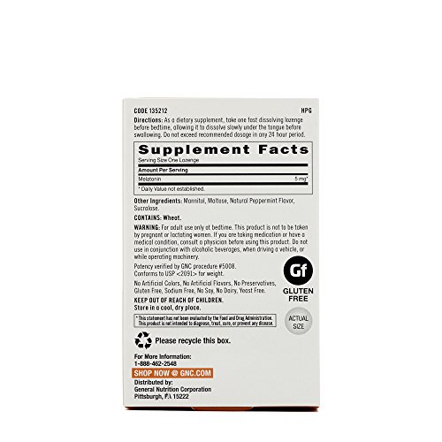 -. Binding : Health and Beauty -. Brand : GNC -. EAN : 0048107123628 -. Feature : Quick Dissolving To Facilitate Absorption / Supports Restful Sleep -. Label : GNC -. LegalDisclaimer : WARNING: For adult use only at bedtime. This product is not to be taken by pregnant or lactating women. If you are taking medication or have a medical condition, consult a physician before using this product. Do not use in conjunction with alcoholic beverages, when driving a vehicle, or while operating machinery.Contains: Wheat -. Manufacturer : GNC -. MPN : 135212 -. PackageQuantity : 1 -. PartNumber : 135212 -. ProductGroup : Health and Beauty -. ProductTypeName : HEALTH_PERSONAL_CARE -. Publisher : GNC -. Size : 60 Vegetarian Lozenges -. Studio : GNC -. Title : GNC Melatonin 5 MG Peppermint 60 Vegetarian Loznges -. UPC : 048107123628