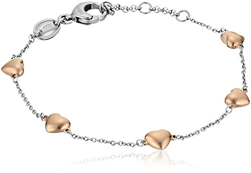 Delicate stainless steel bracelet featuring polished rose-tone heart stations