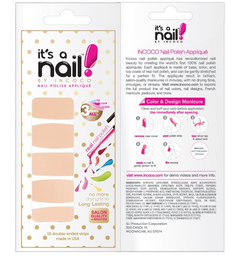 THE PERFECT MANICURE IN MINUTES! Incoco has revolutionized nail beauty by creating the world's first 100% real nail polish appliques! Each applique is made of a base, color and top coat of real nail polish. These appliques are flexible and can be gently stretched to easily fit any nail size and shape. The result is a brilliant, salon-quality manicure in minutes with no dry time, smudges or streaks.Feature