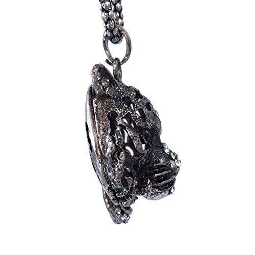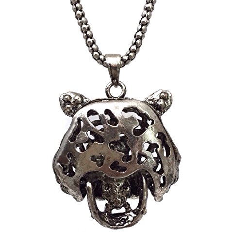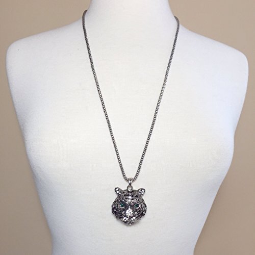 Long Silver Tone Tiger Face Rhinestone Green Eyes Necklace